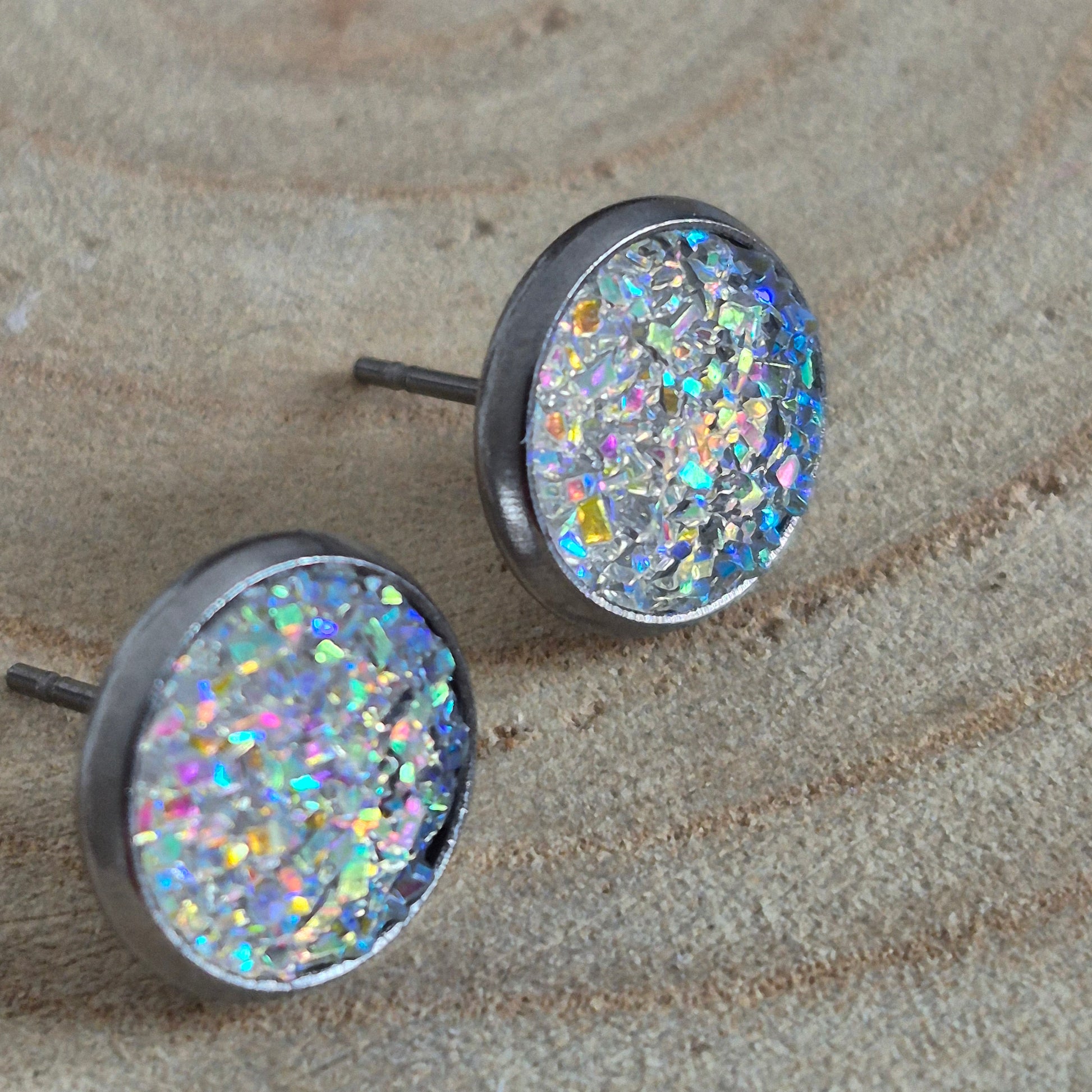 Sparkly domed stud earrings, with clear AB glitter resin set into stainless steel bezel studs with butterfly backs