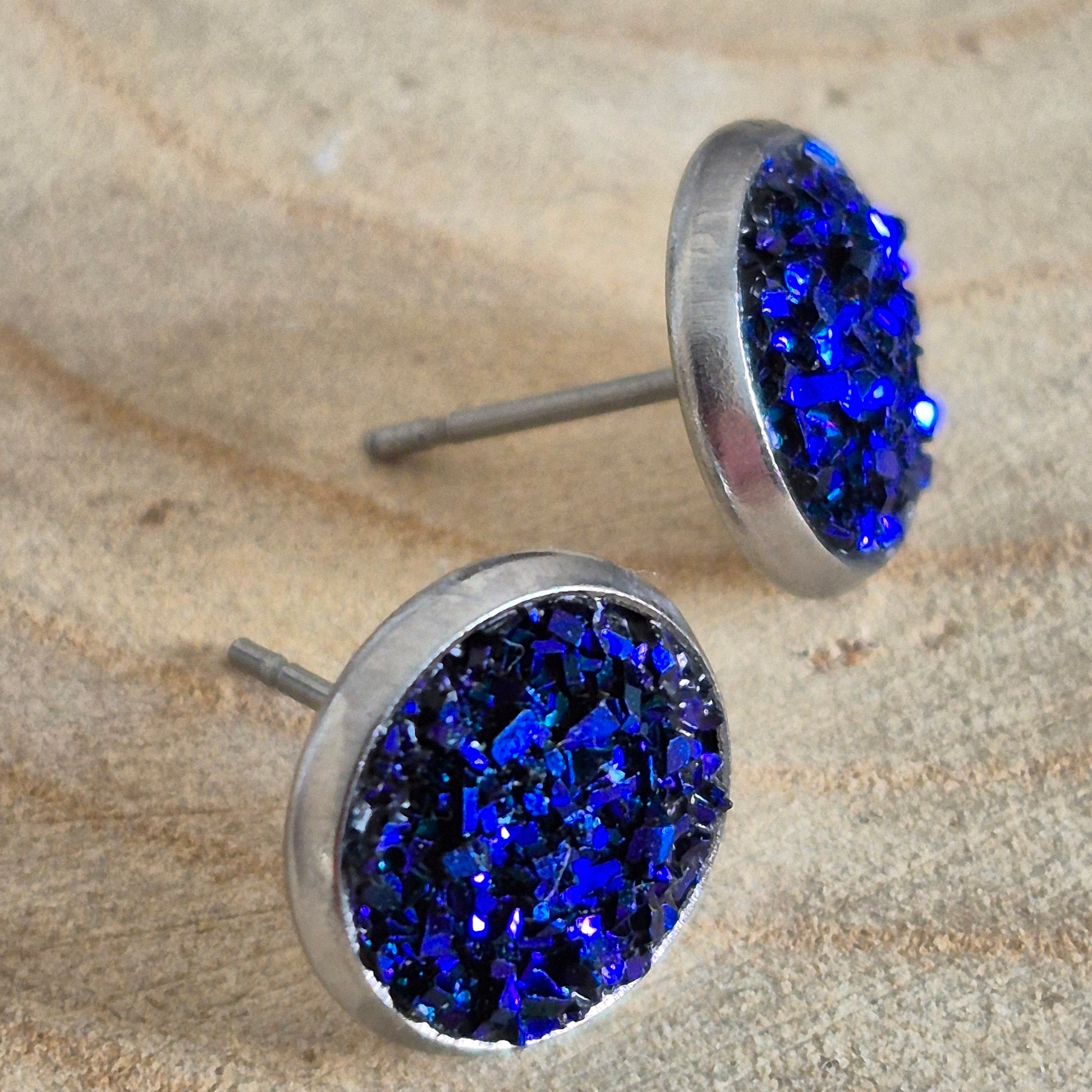 Sparkly domed stud earrings, with deep blue glitter resin set into stainless steel bezel studs with butterfly backs