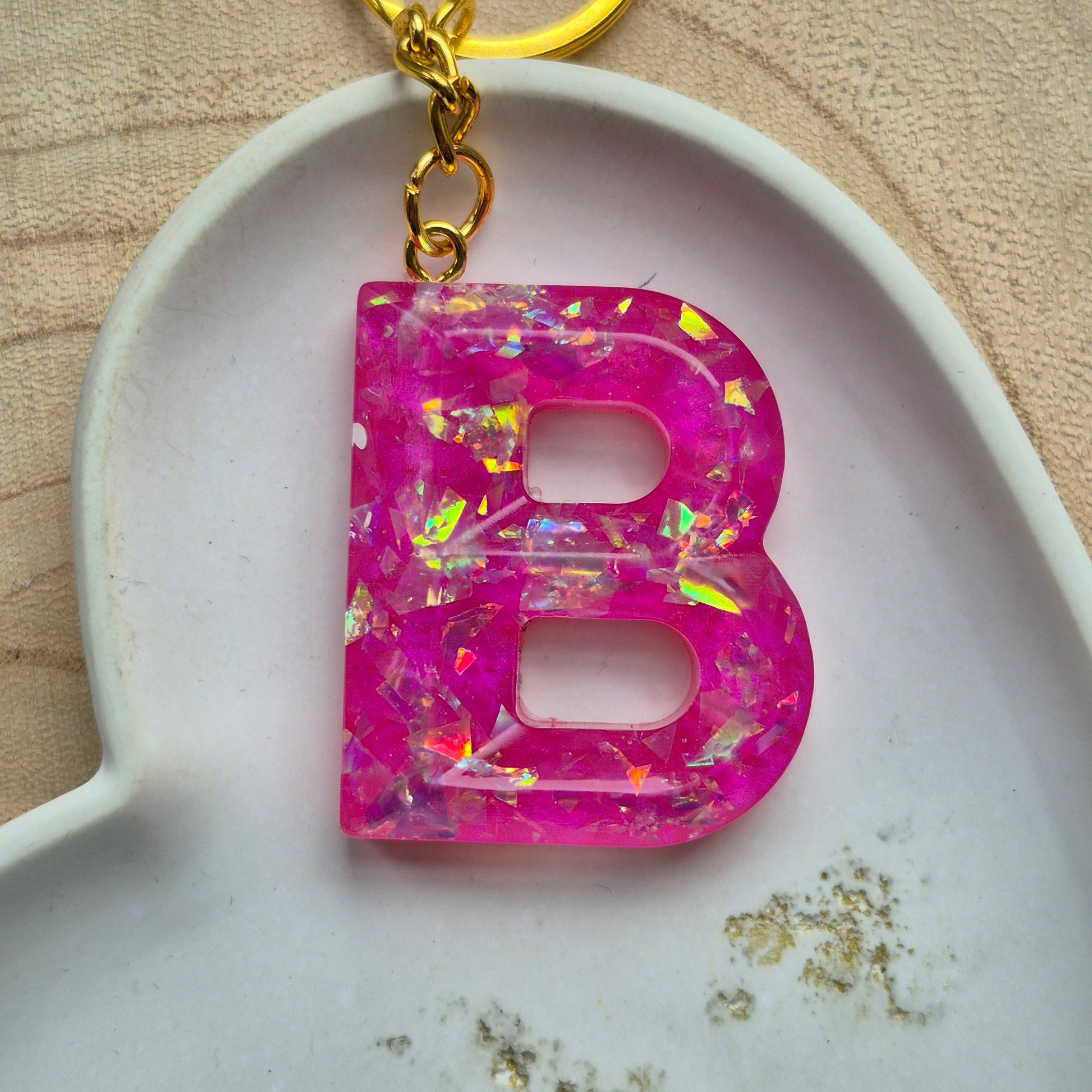 Handmade faceted resin initial keychain letter B. We have various colours available, please see individual pictures for colours and styles. The initial will be attached to either a silver coloured or gold coloured keyring and chain.