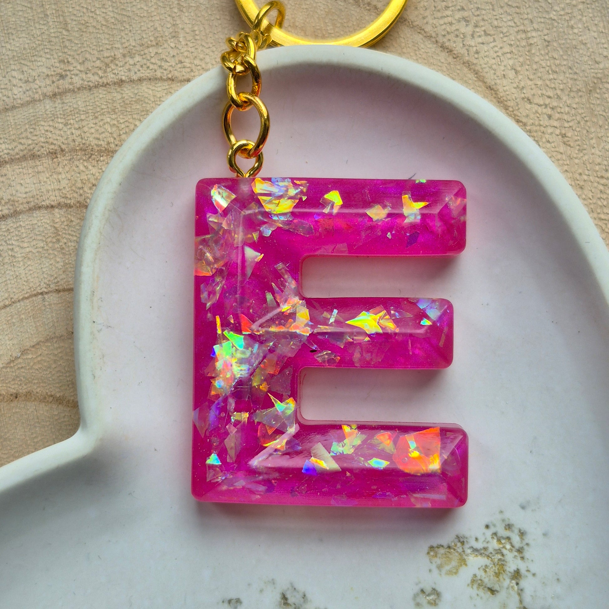 Handmade faceted resin initial keychain letter E. We have various colours available, please see individual pictures for colours and styles. The initial will be attached to either a silver coloured or gold coloured keyring and chain.