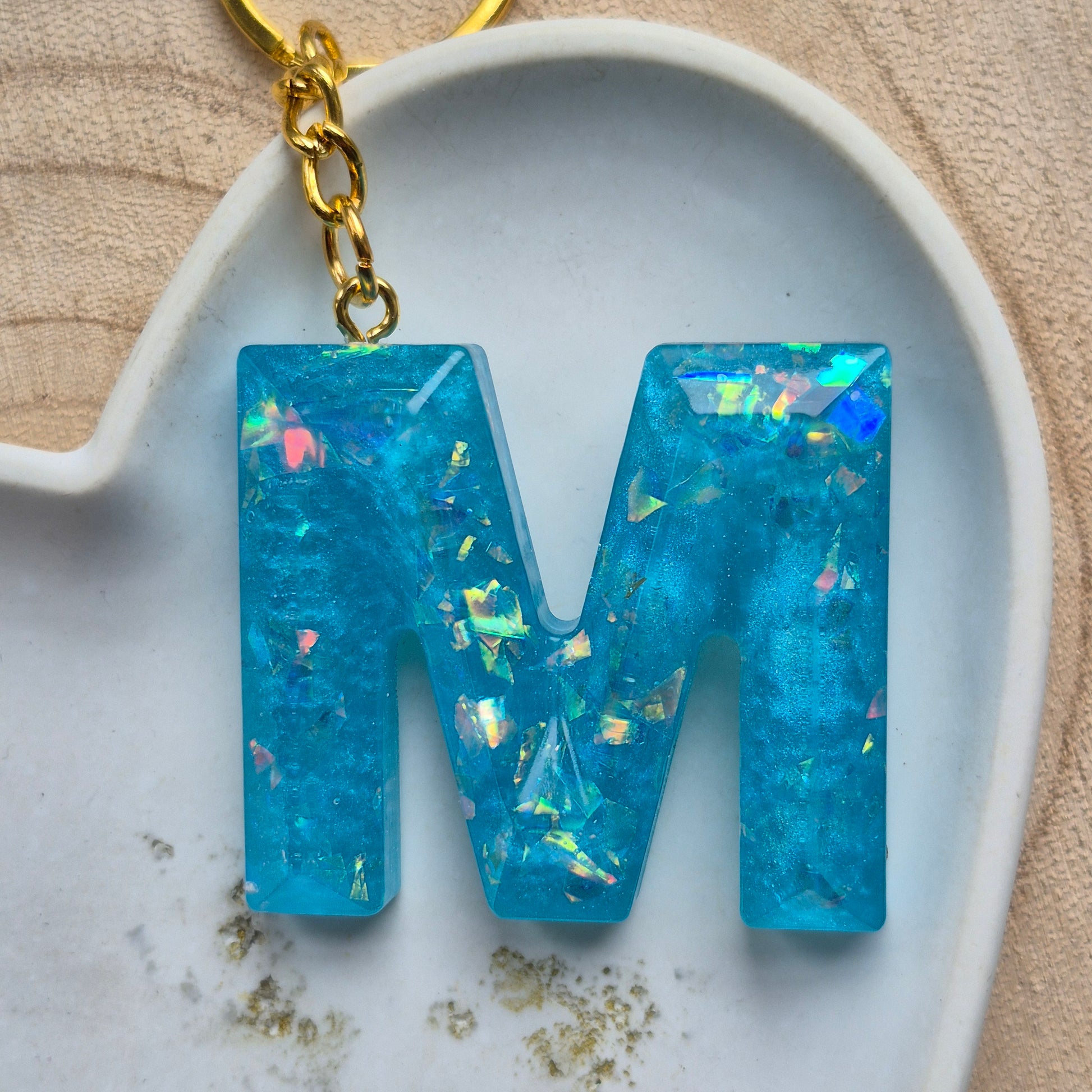 Handmade faceted resin initial keychain letter M. We have various colours available, please see individual pictures for colours and styles. The initial will be attached to either a silver coloured or gold coloured keyring and chain.