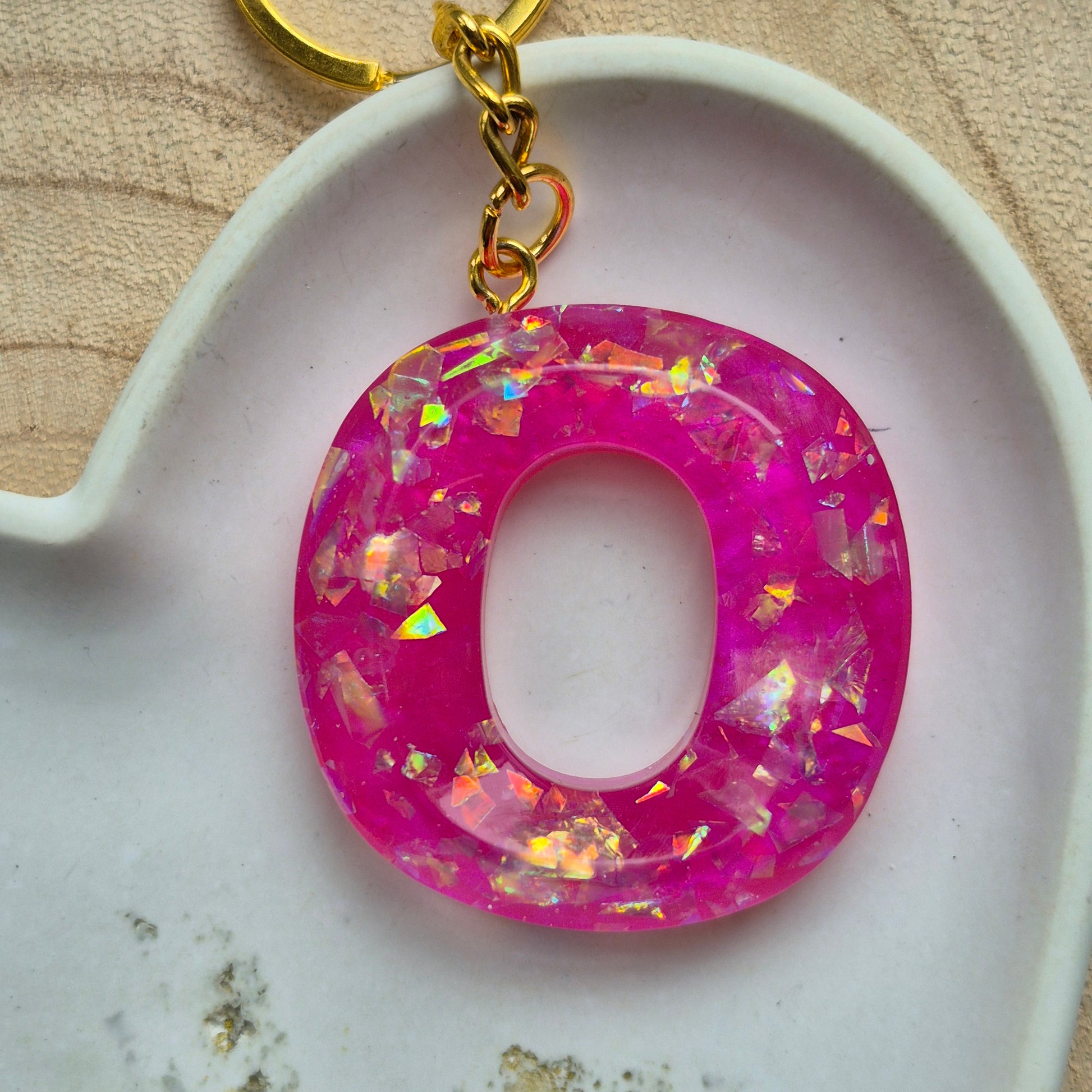 Handmade faceted resin initial keychain letter O. We have various colours available, please see individual pictures for colours and styles. The initial will be attached to either a silver coloured or gold coloured keyring and chain.