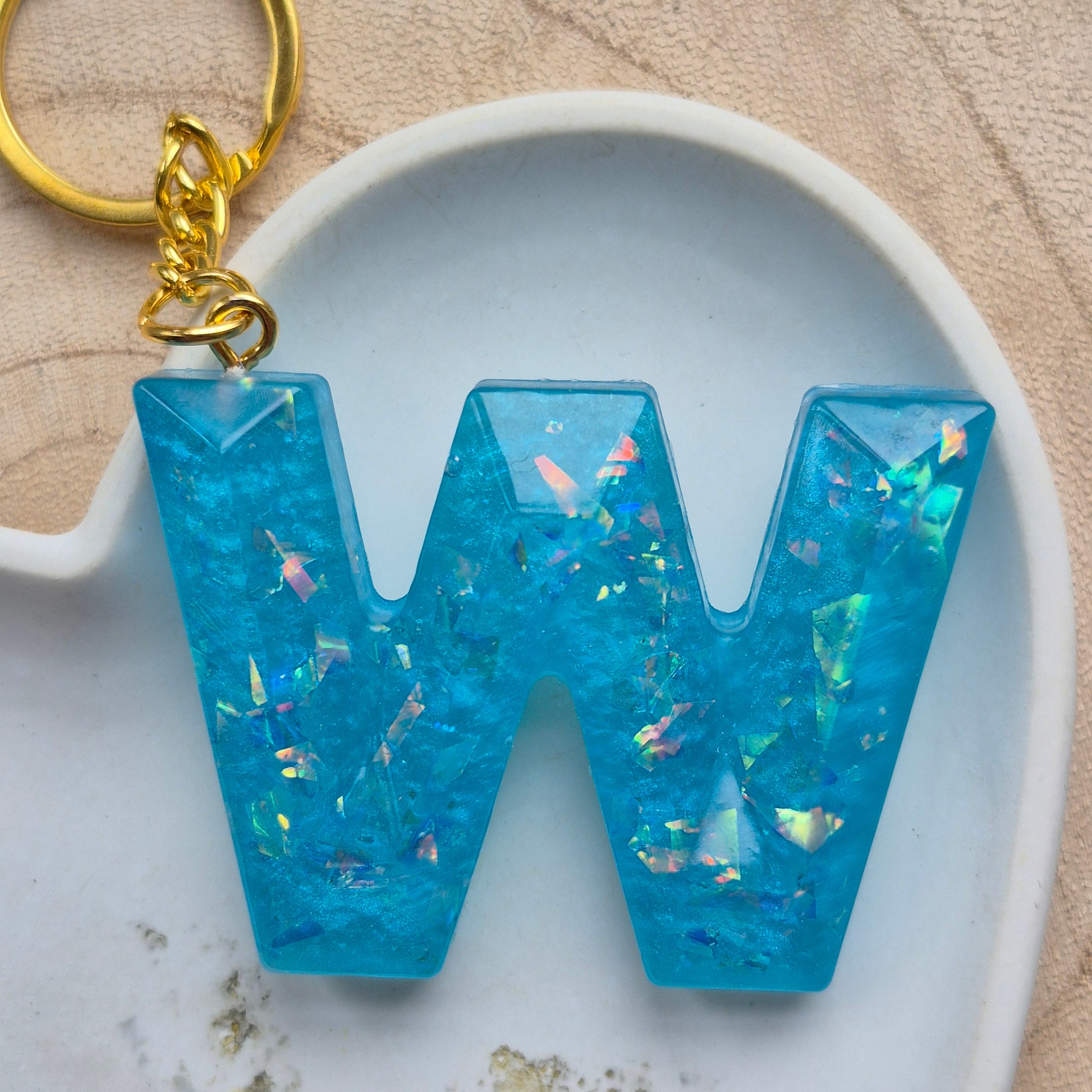 Handmade faceted resin initial keychain letter W. We have various colours available, please see individual pictures for colours and styles. The initial will be attached to either a silver coloured or gold coloured keyring and chain.