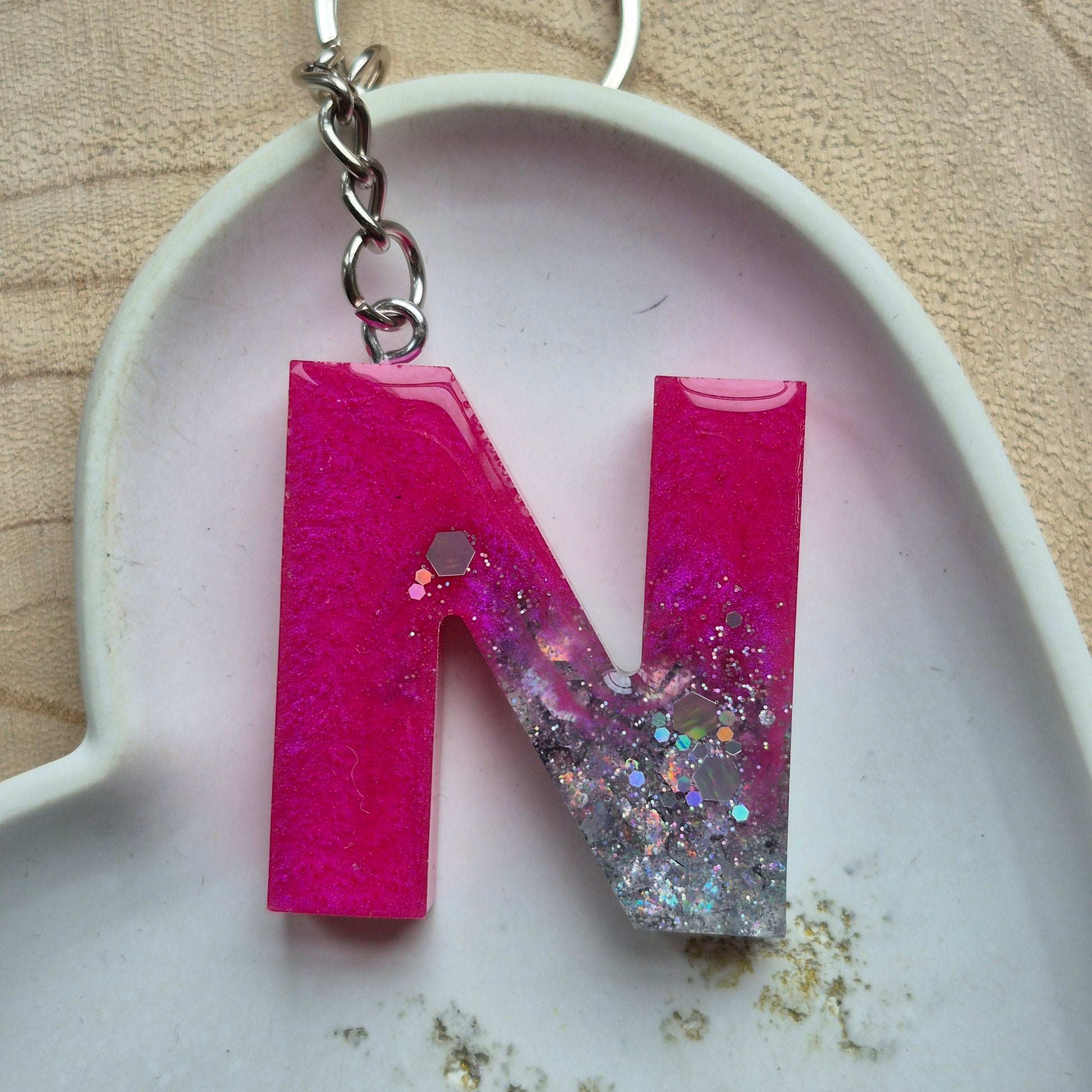 Handmade resin initial keychain letter N. We have various colours available, please see individual pictures for colours and styles. The initial will be attached to either a silver coloured or gold coloured keyring and chain.