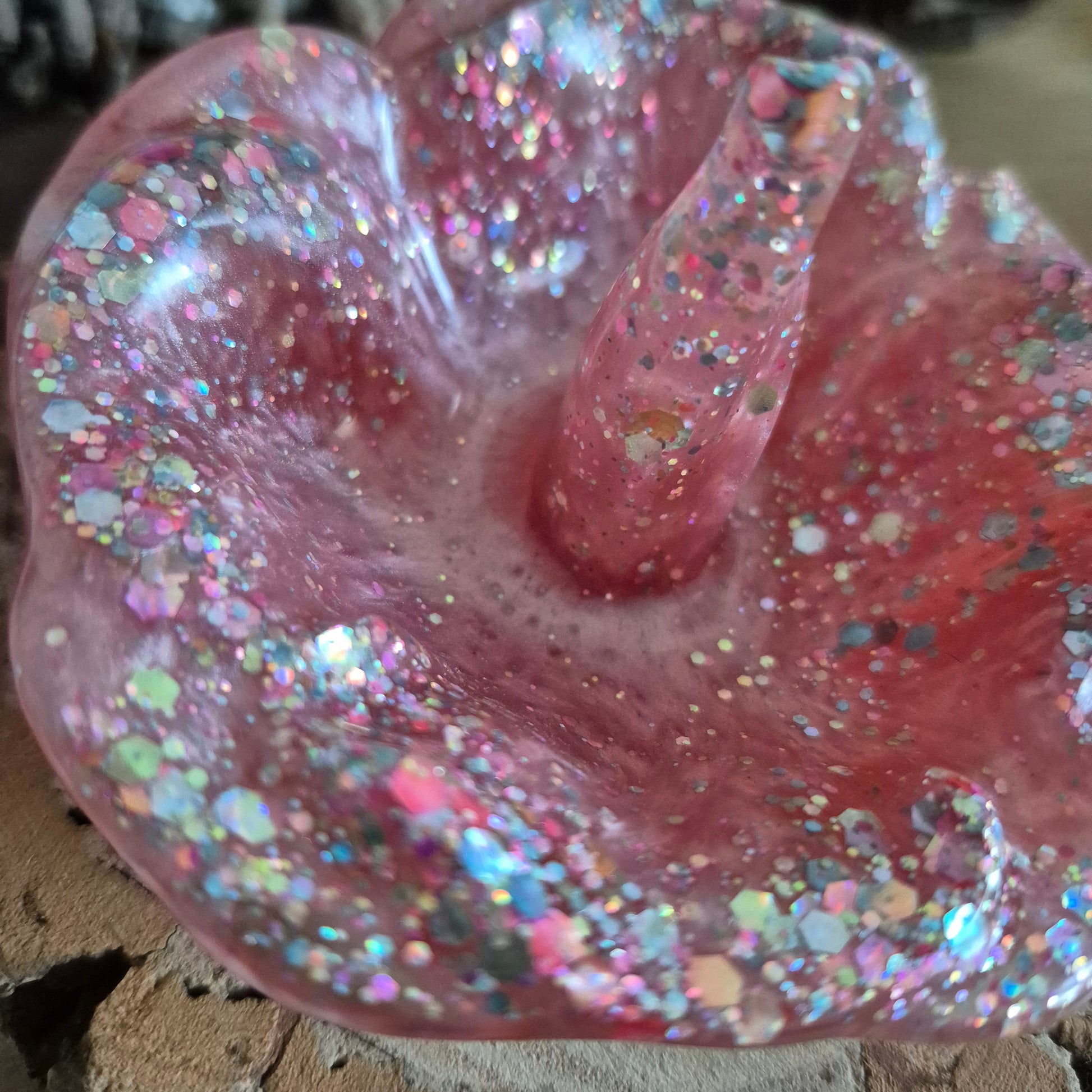 This ring holder is resin with iridescent silver glitter and soft pink mica for a subtle sparkle.