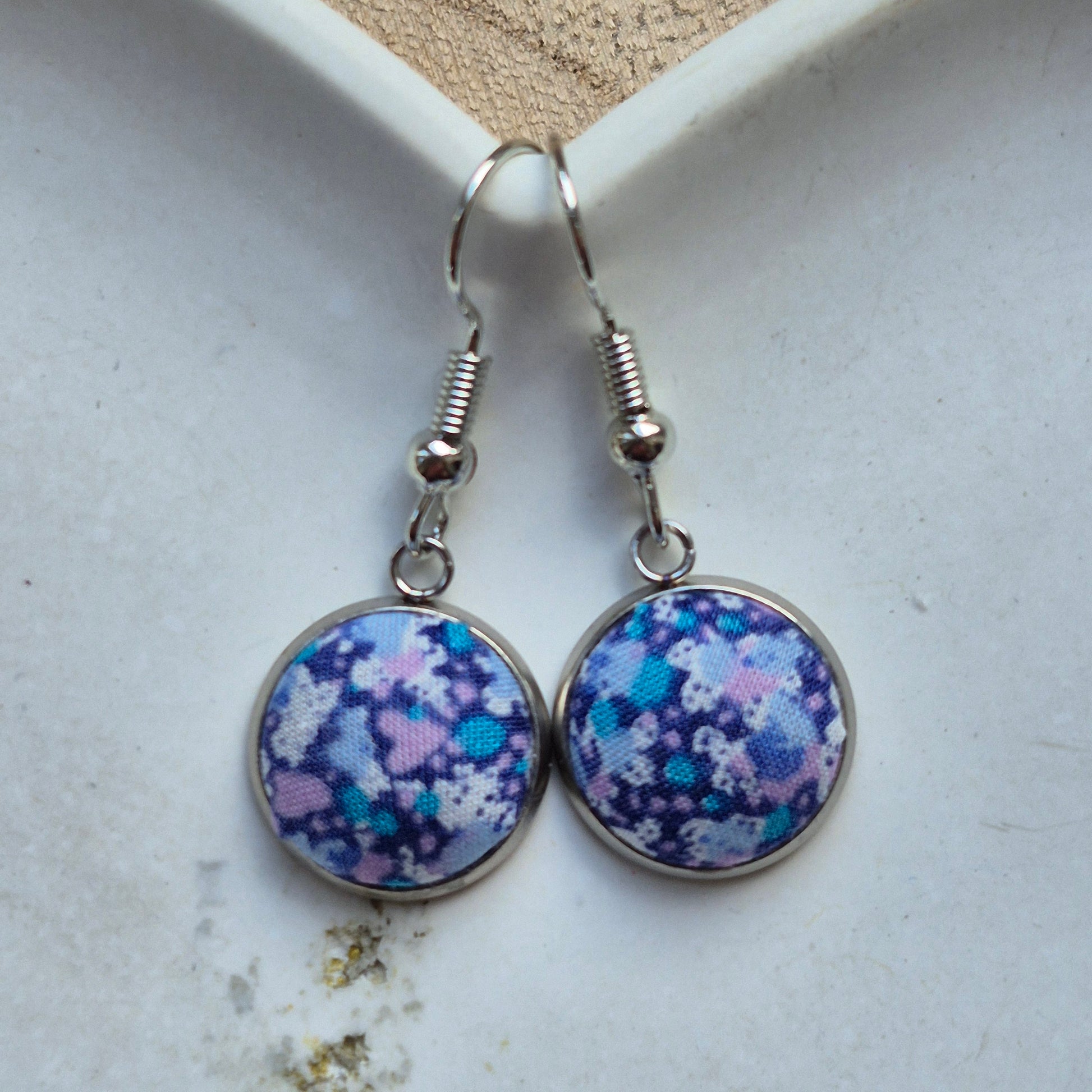Delicate domed dangle earrings, with vintage Liberty in a blue mini floral design set into stainless steel bezel discs and suspended from stainless steel earring hooks.
