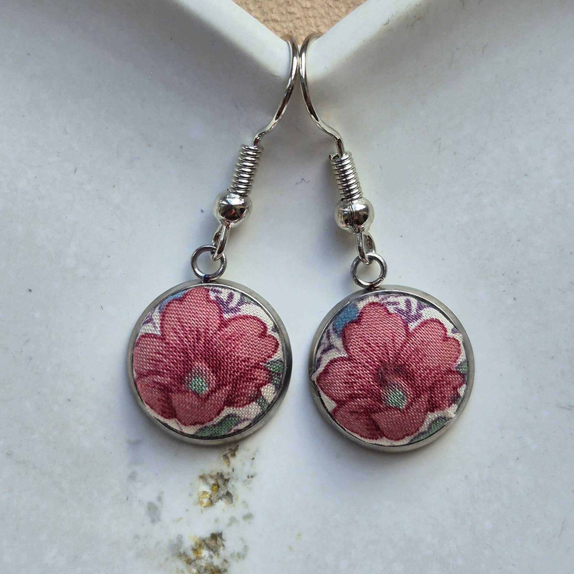 Delicate domed dangle earrings, with vintage Liberty in a deep peach flower design set into stainless steel bezel discs and suspended from stainless steel earring hooks.