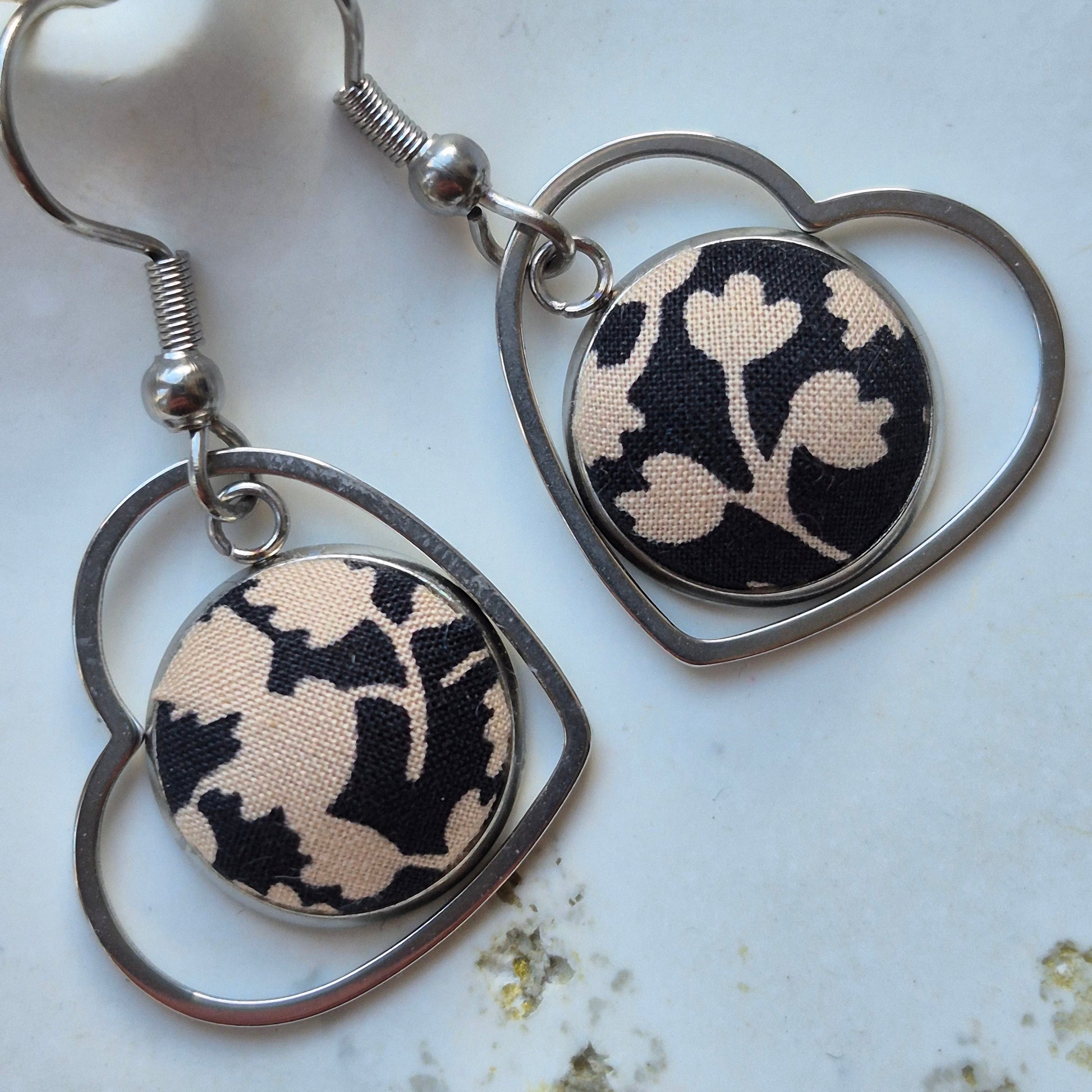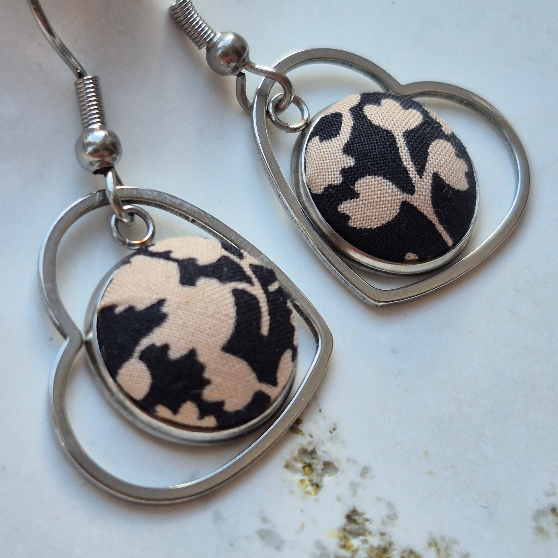 Delicate domed dangle earrings, with vintage Liberty in a cream leafy design set into stainless steel bezel discs with added heart frames and suspended from stainless steel earring hooks.