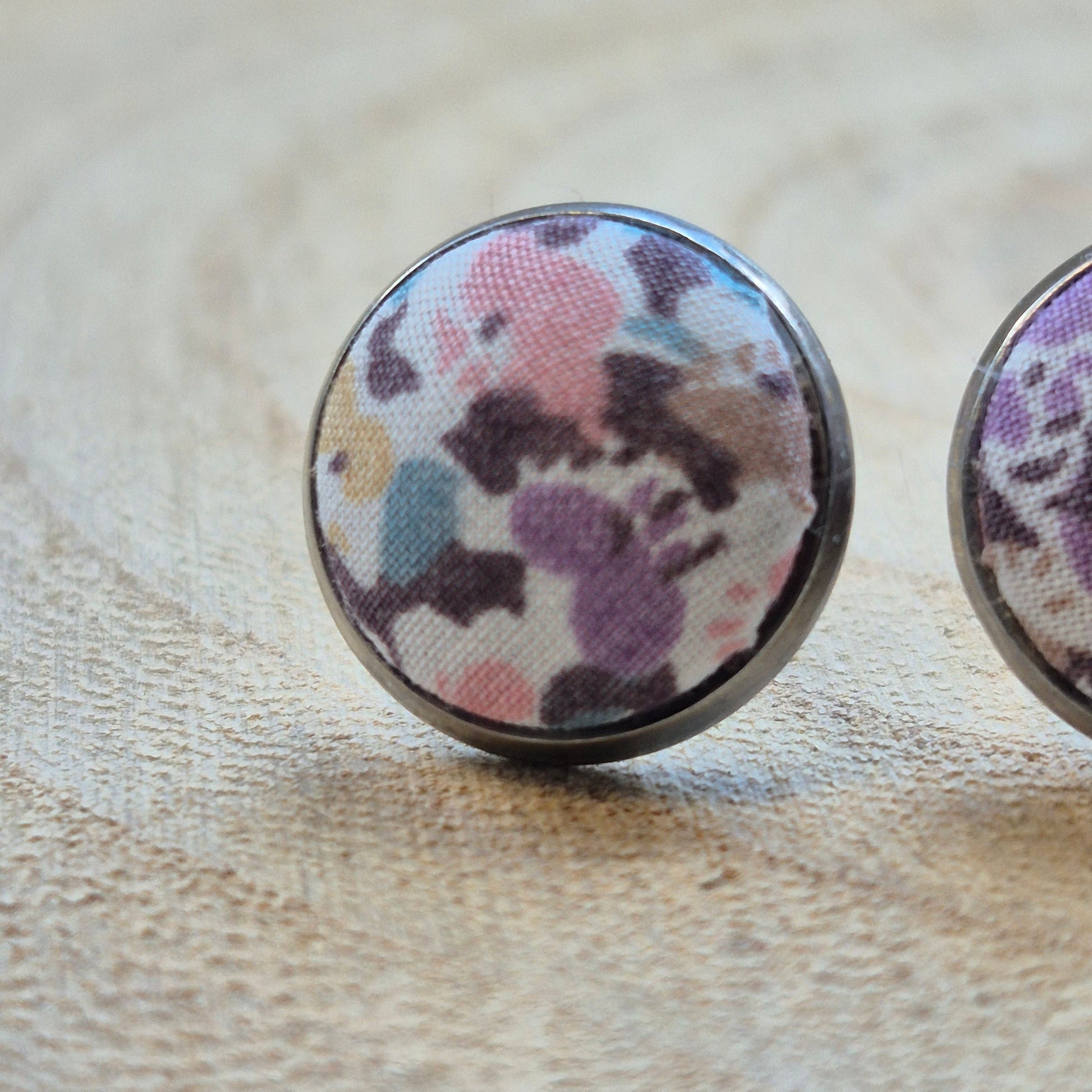 Delicate domed stud earrings, with vintage Liberty in a lilac ditsy floral design set into a stainless steel bezel stud with butterfly backs
