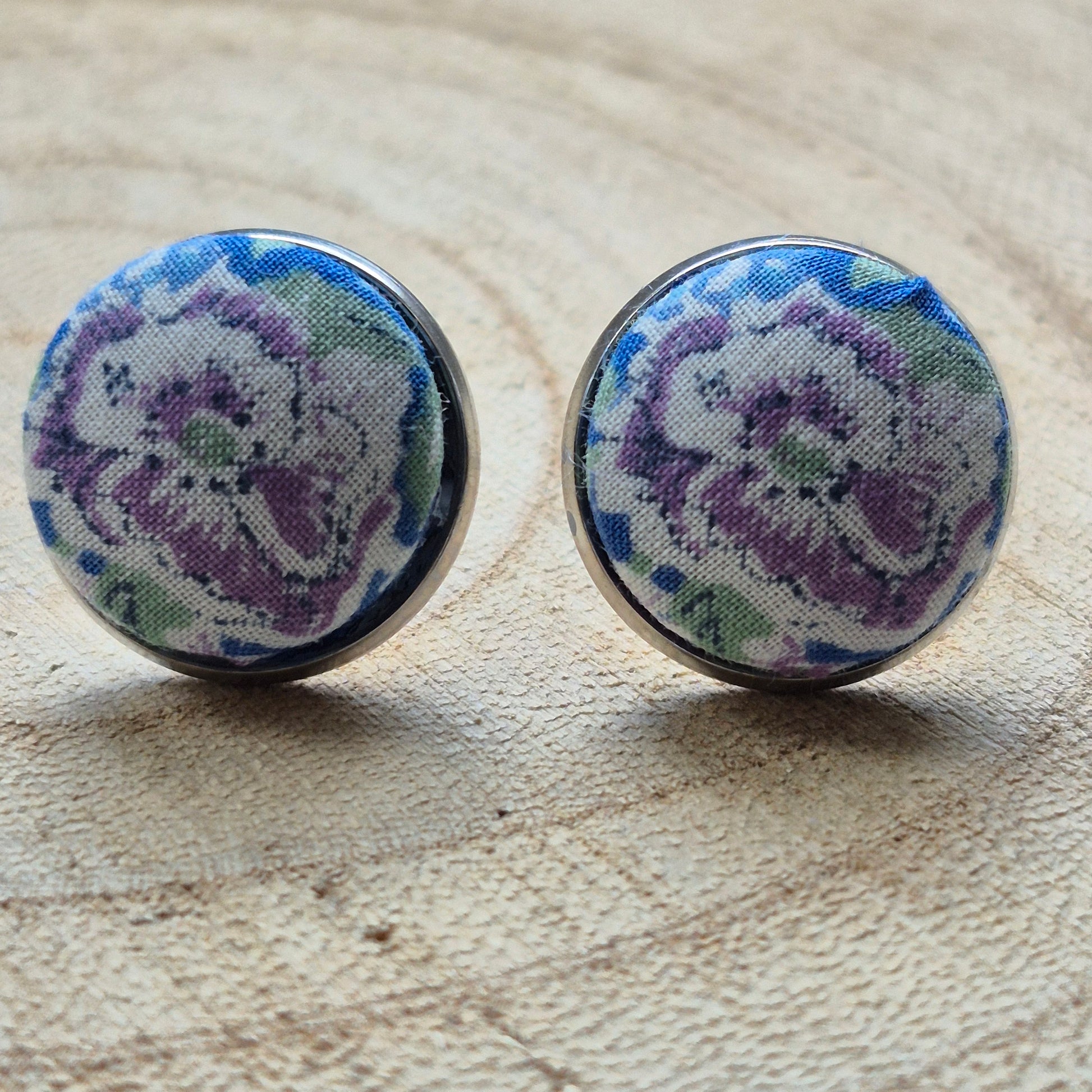 Delicate domed stud earrings, with vintage Liberty in an lilac flower design set into a stainless steel bezel stud with butterfly backs