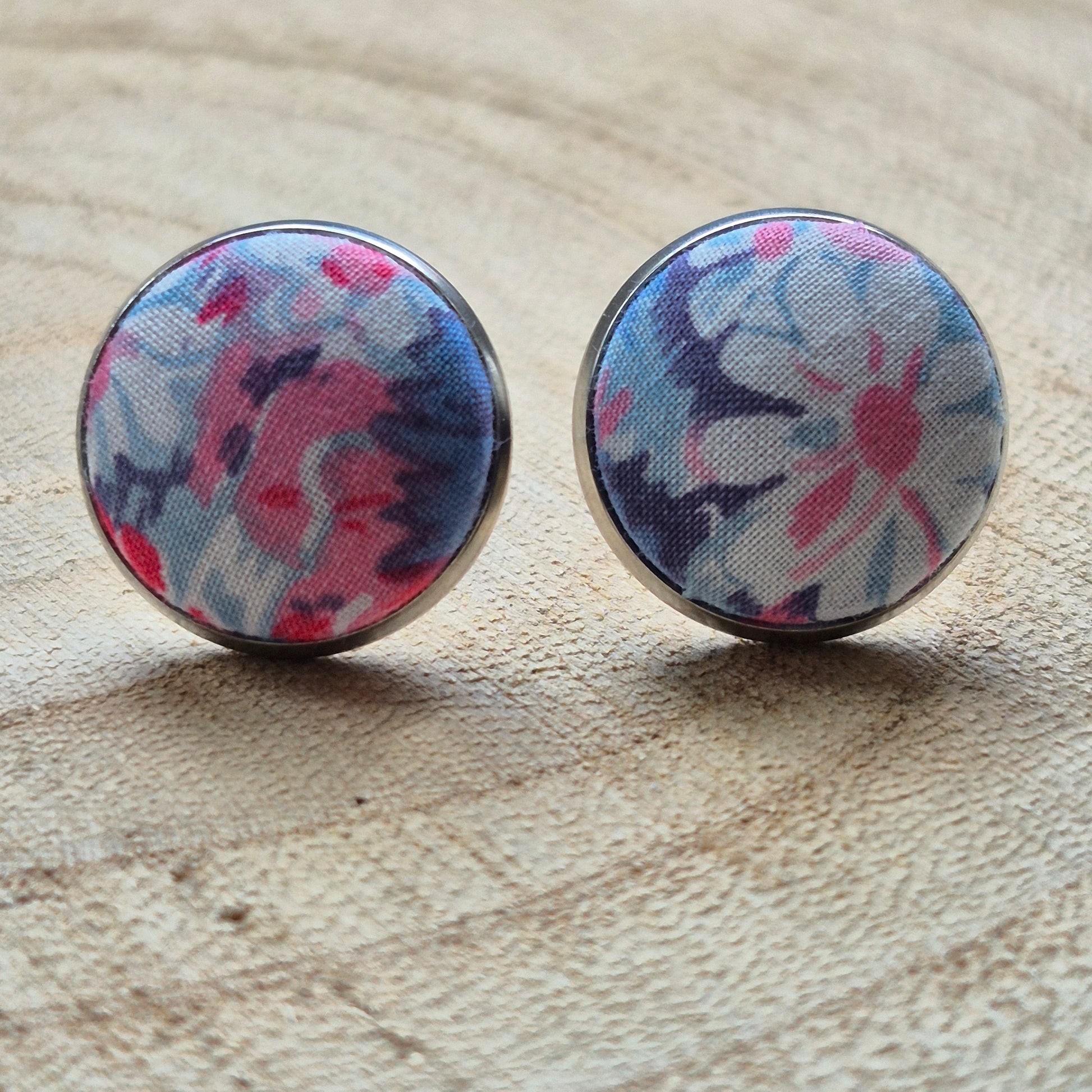 Delicate domed stud earrings, with vintage Liberty in an pink daisy design set into a stainless steel bezel stud with butterfly backs