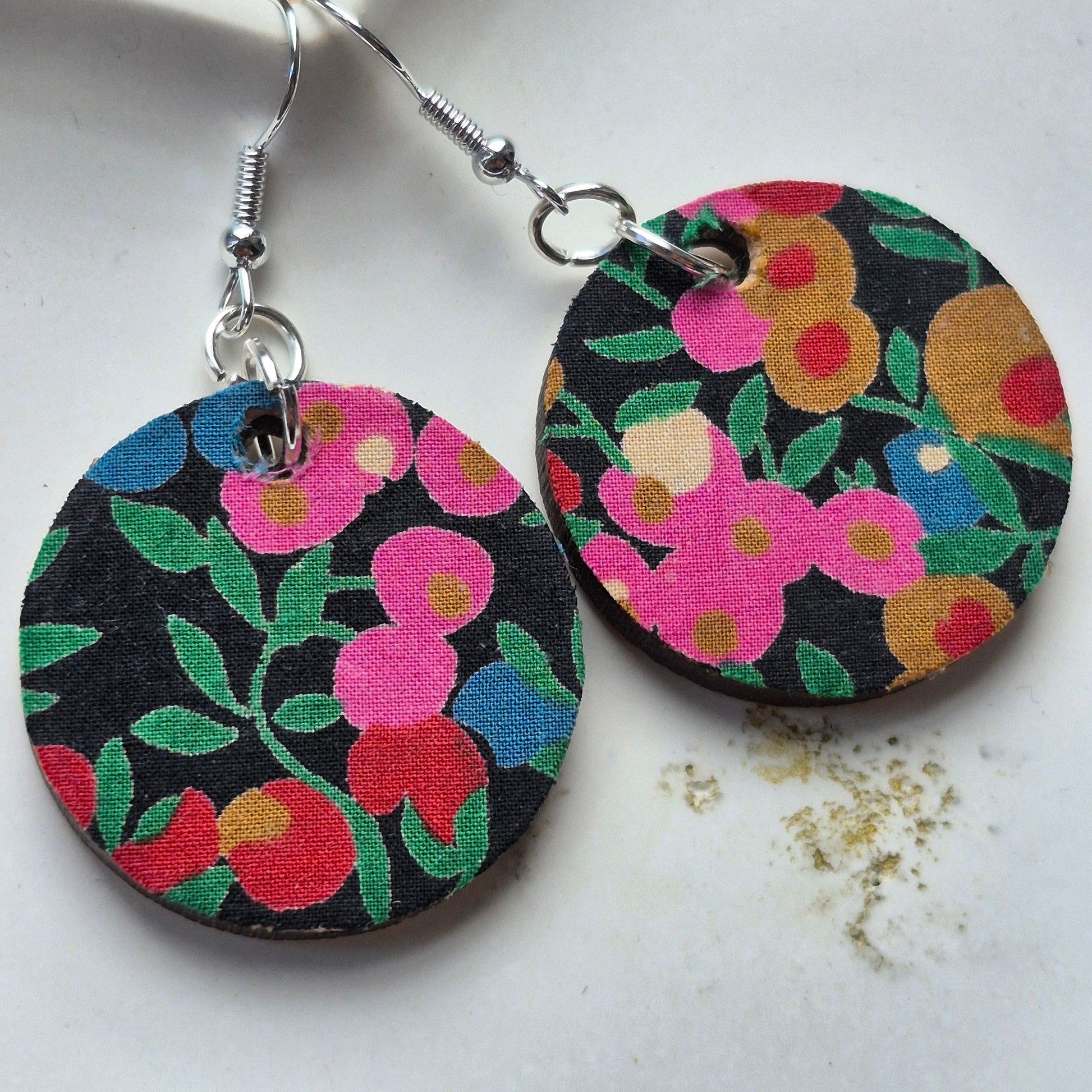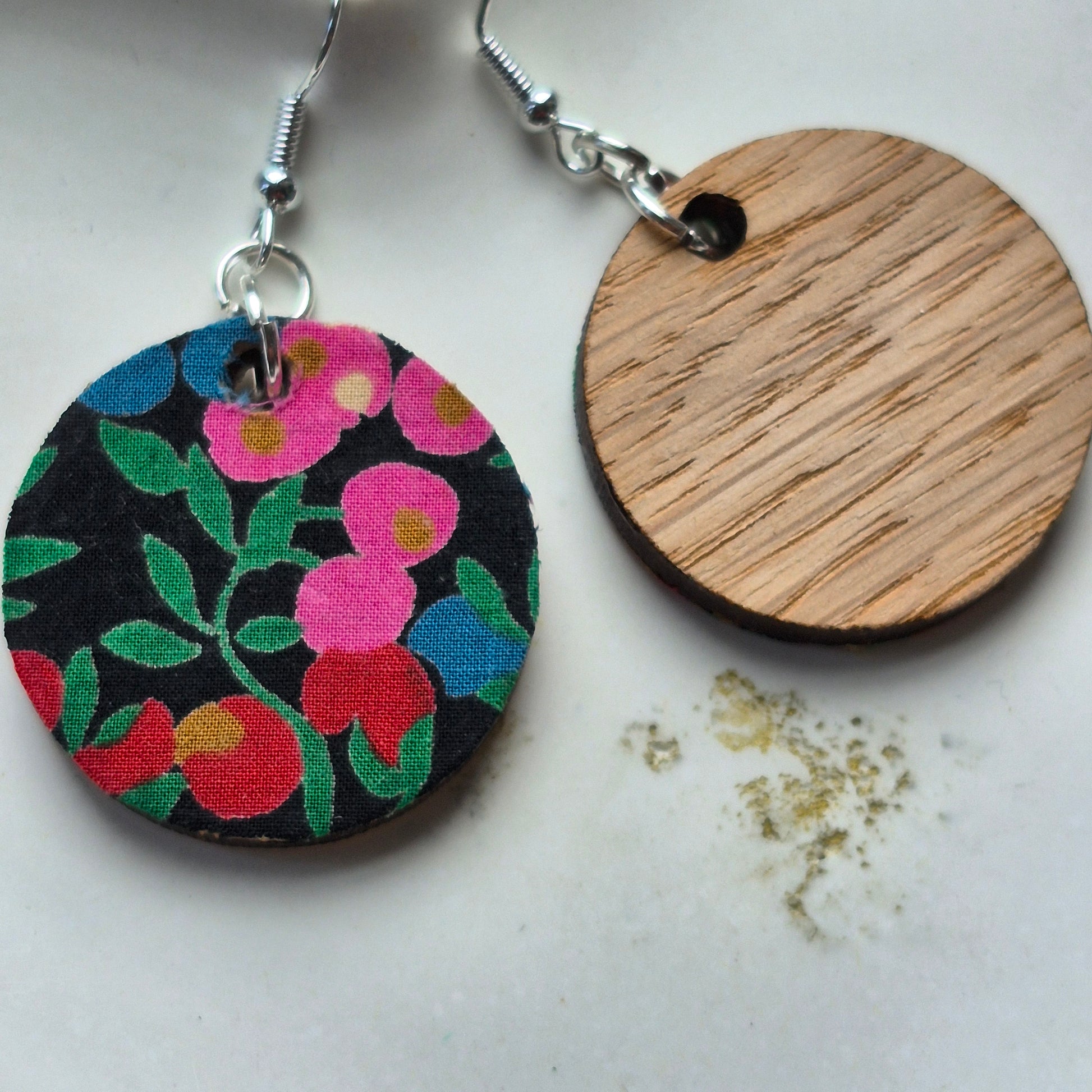 Chunky wooden dangle earrings, with vintage Liberty fabric in a peach berry design on oak veneer circle shaped blanks and suspended from silver coloured earring hooks.