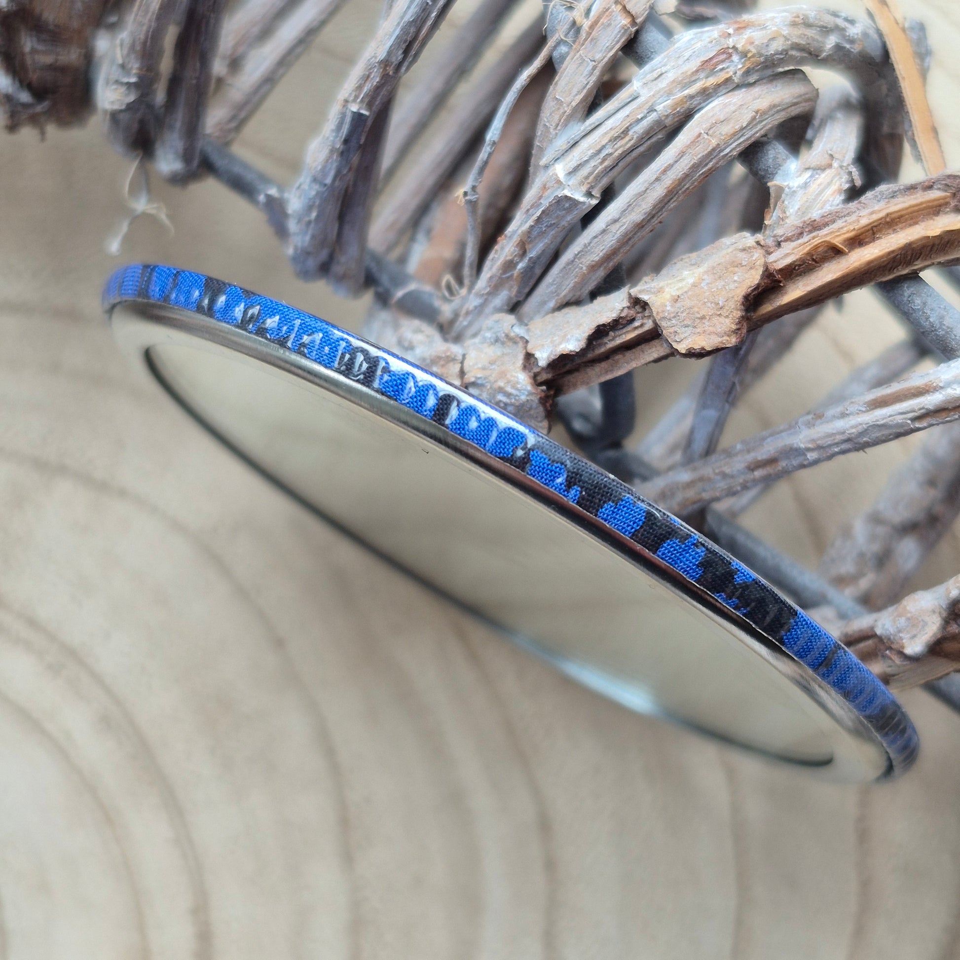 This elegant compact mirror features a vintage Liberty print with a blue leafy vine design in vibrant fuchsia. Its round shape is encased in a sleek silver metal frame, offering both durability and style. Presented with a black velvet pouch, it’s a practical and refined accessory perfect for touch-ups on the go.