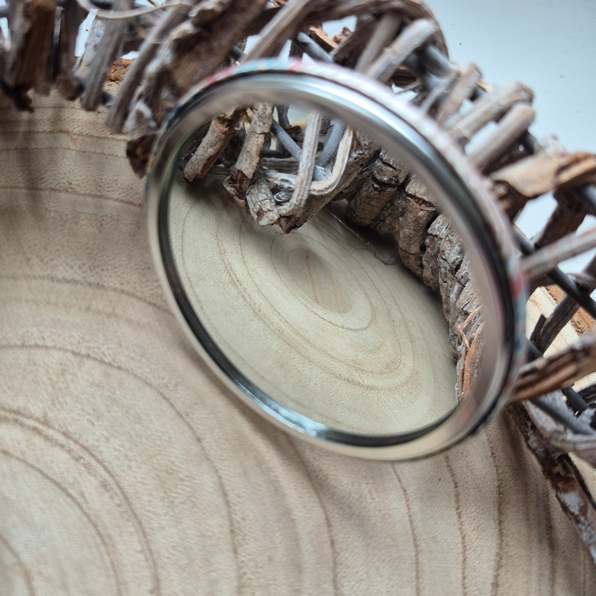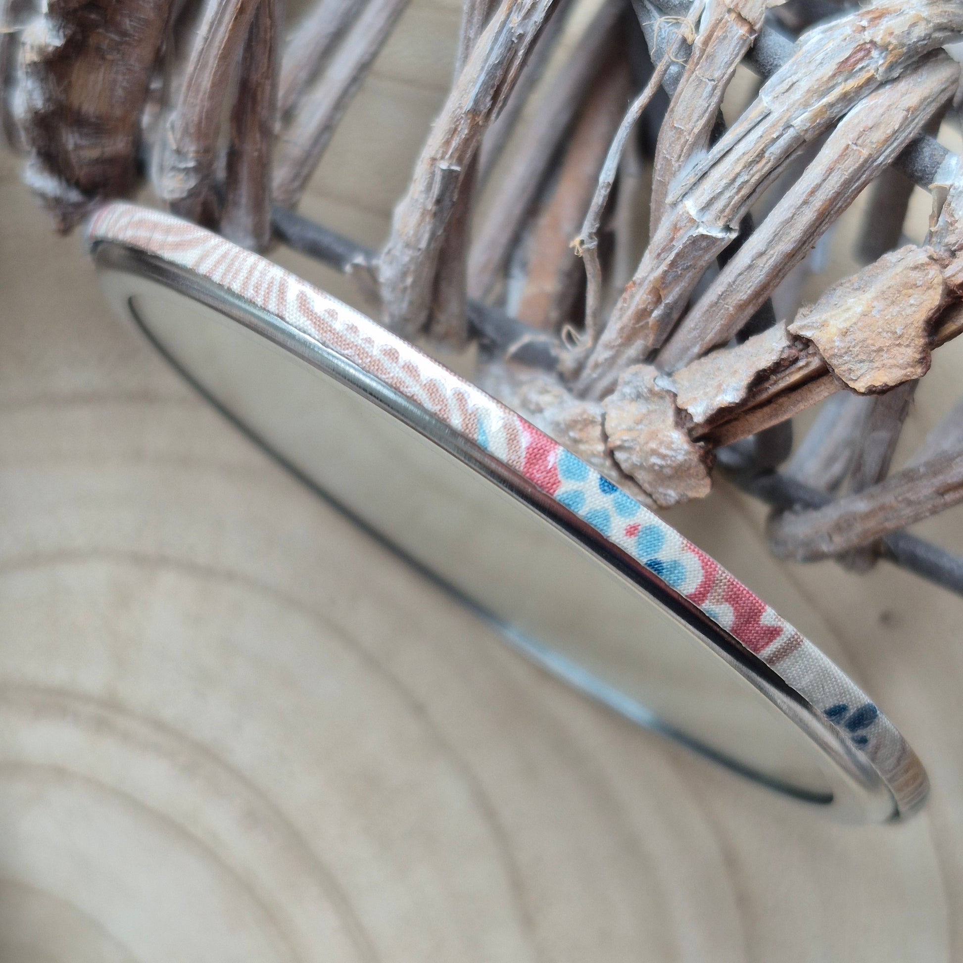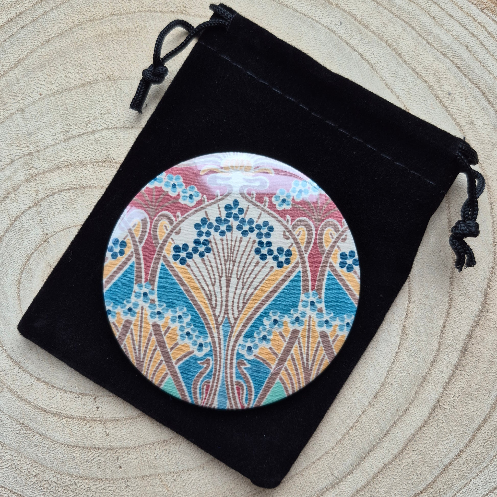 This elegant compact mirror features a vintage Liberty print with a cream art deco design in vibrant fuchsia. Its round shape is encased in a sleek silver metal frame, offering both durability and style. Presented with a black velvet pouch, it’s a practical and refined accessory perfect for touch-ups on the go.