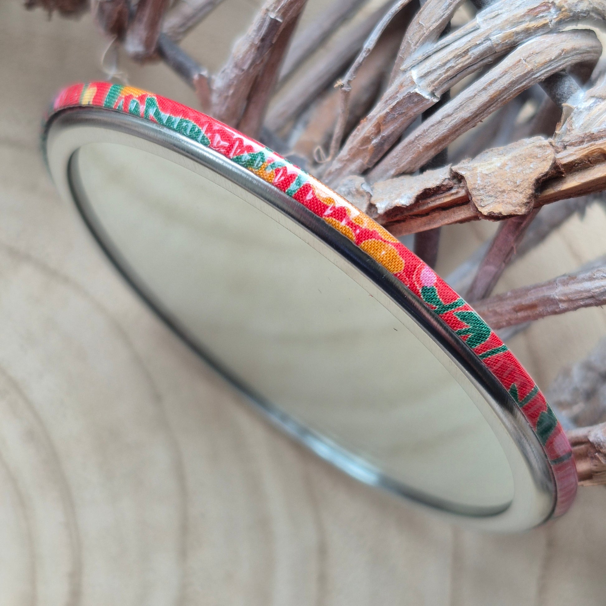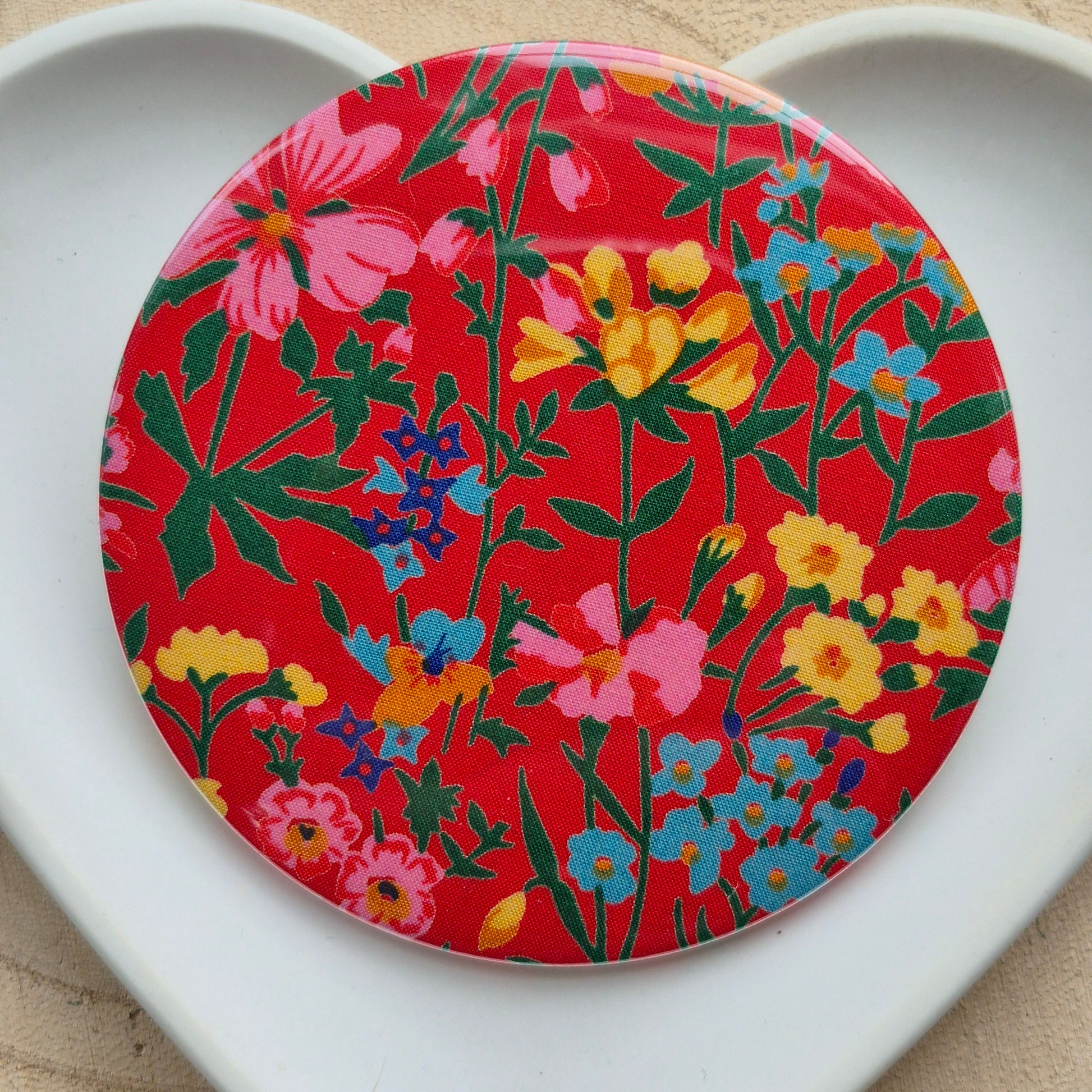 This elegant compact mirror features a vintage Liberty print with a red floral design in vibrant fuchsia. Its round shape is encased in a sleek silver metal frame, offering both durability and style. Presented with a black velvet pouch, it’s a practical and refined accessory perfect for touch-ups on the go.